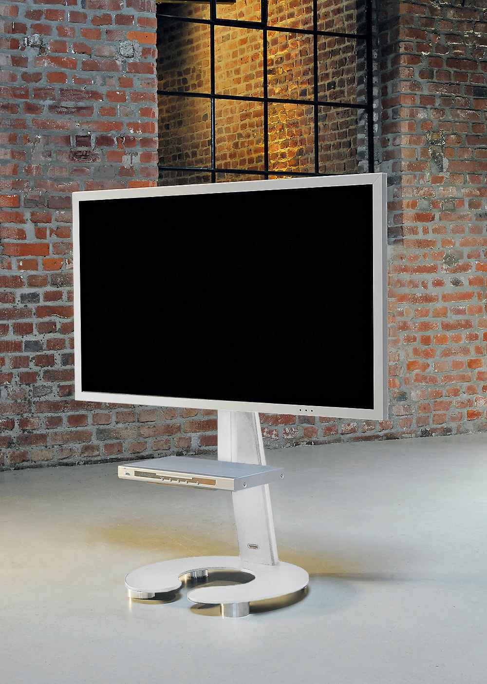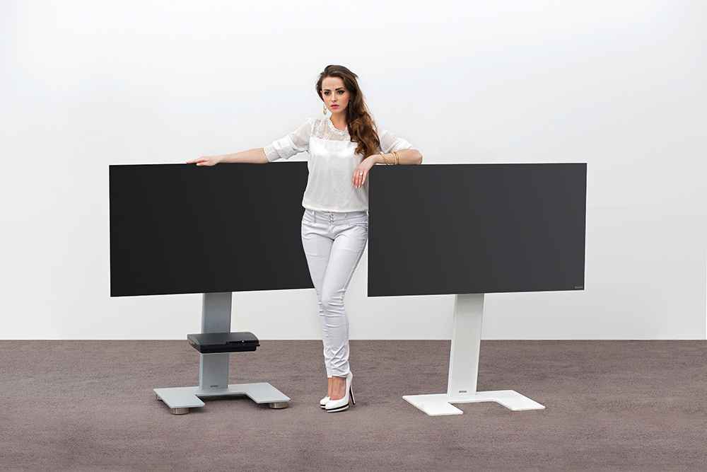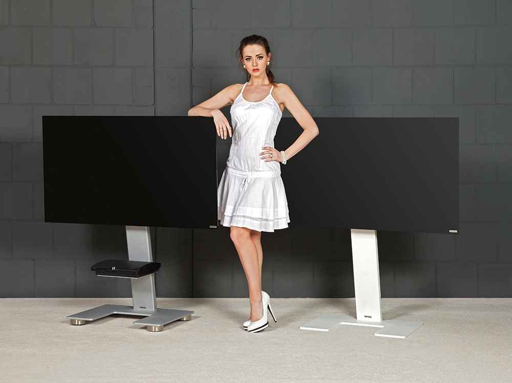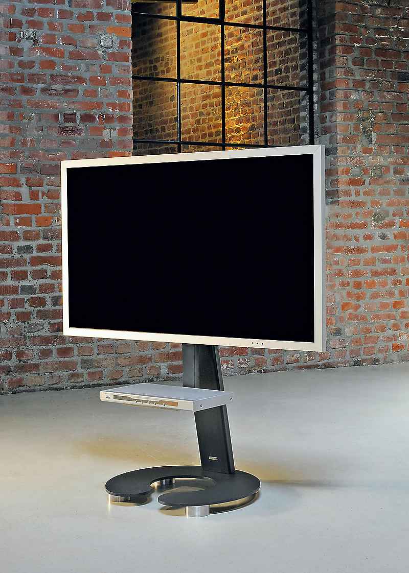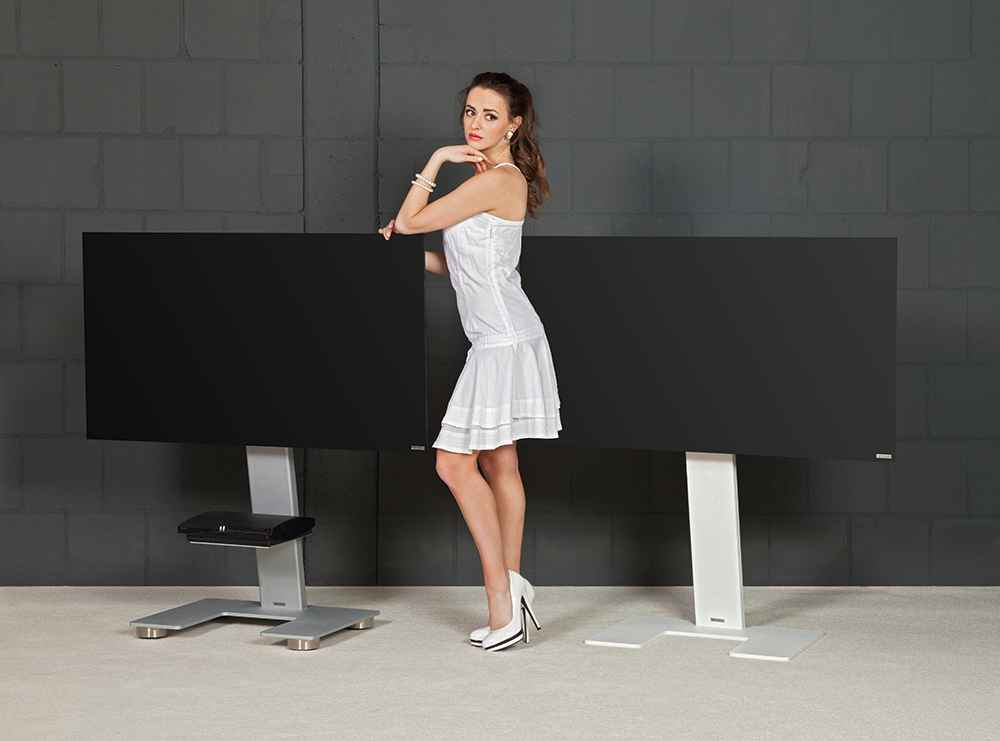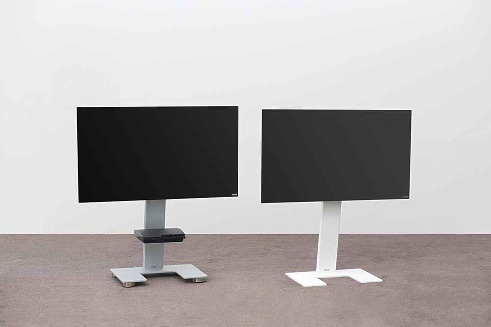 Weniger ist mehr: Minimalistischer TV-Halter als Standversion mit klarer Formensprache. Auf Wunsch mit unsichtbaren Rollen.