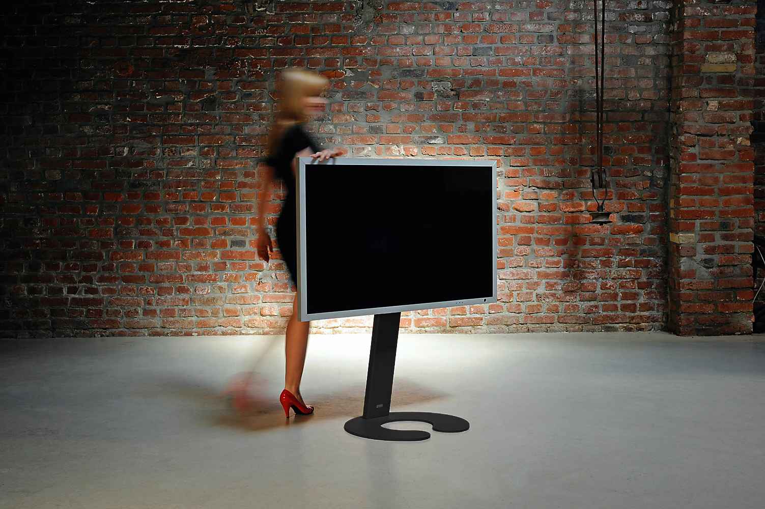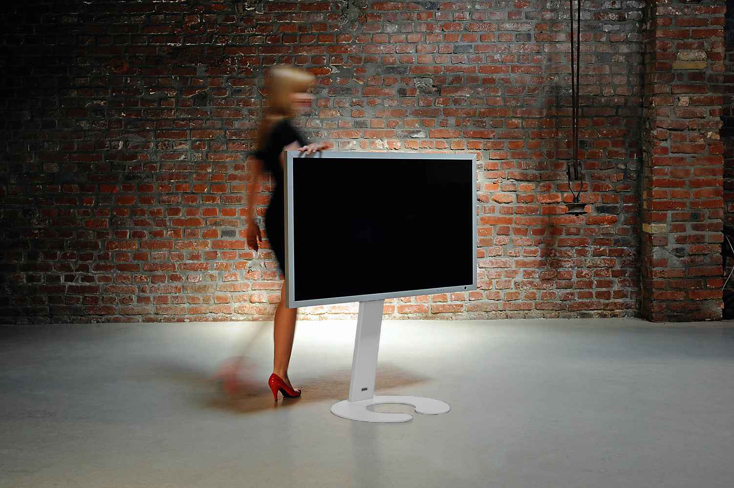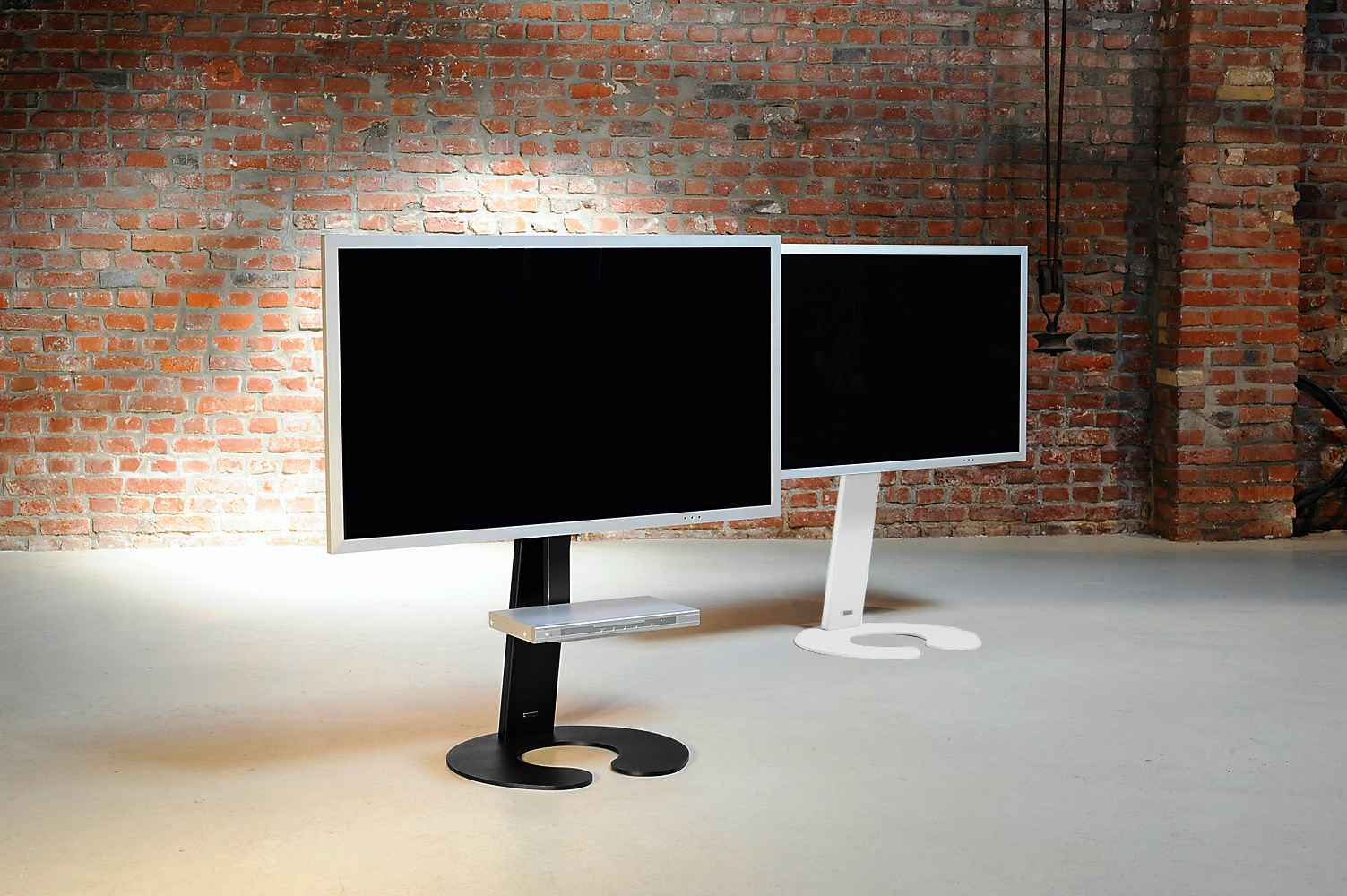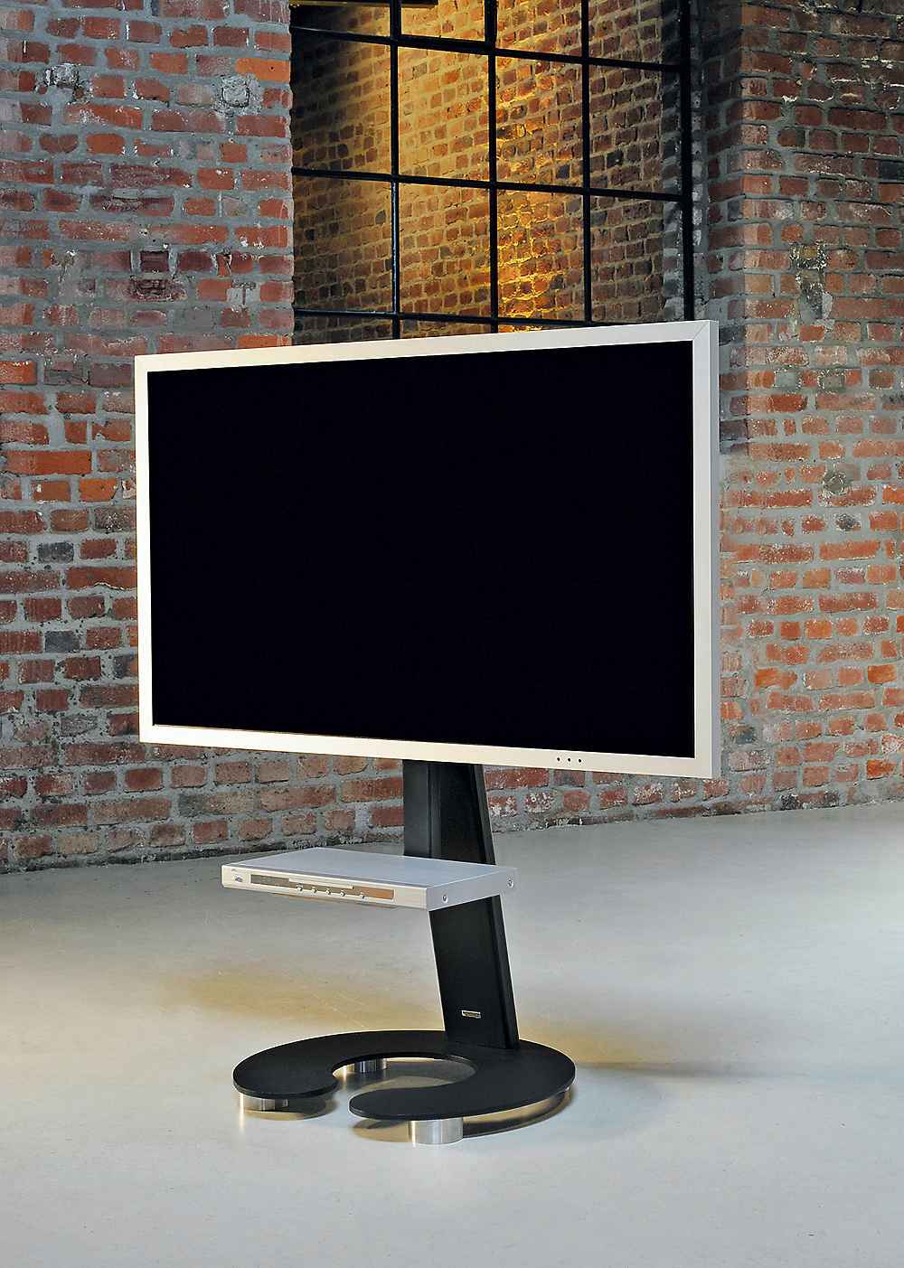 Weniger ist mehr: Minimalistischer TV-Halter als Standversion mit klarer Formensprache. Auf Wunsch mit unsichtbaren Rollen.