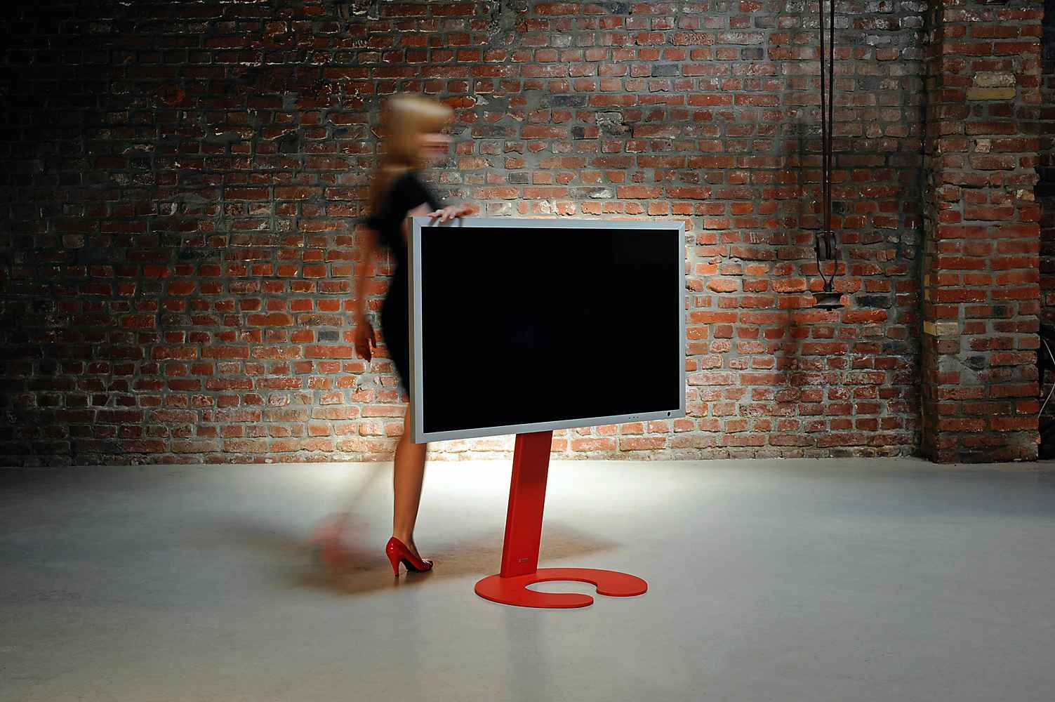 Less is more: Minimalist TV mount as a standing version with a clear design language. On request with invisible castors.